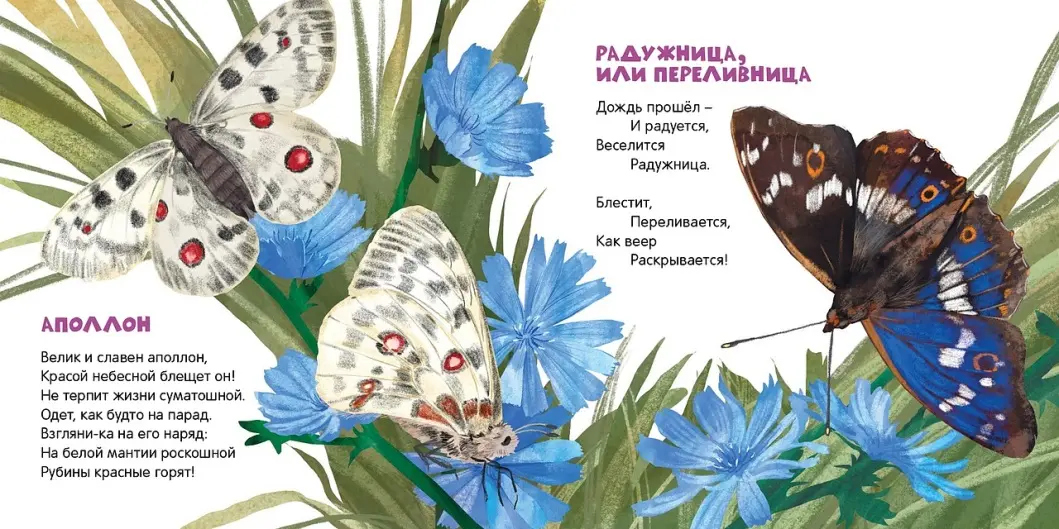 Стихи Михаила Лукашевича познакомят ребят с махаоном, бражником, радужницей и другими бабочками, которых можно встретить на территории нашей страны, а также помогут малышу понять, насколько важно ценить и беречь этих уникальных насекомых.