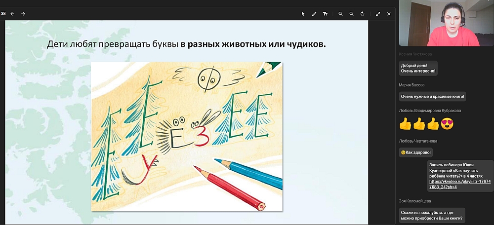 Юлия Кузнецова поделилась практическими приёмами из своего опыта писателя и педагога. Участники узнали, как превратить знакомство с буквами в игру, как интересно говорить с детьми о картинах и как поддержать ребёнка, который только начинает творить.