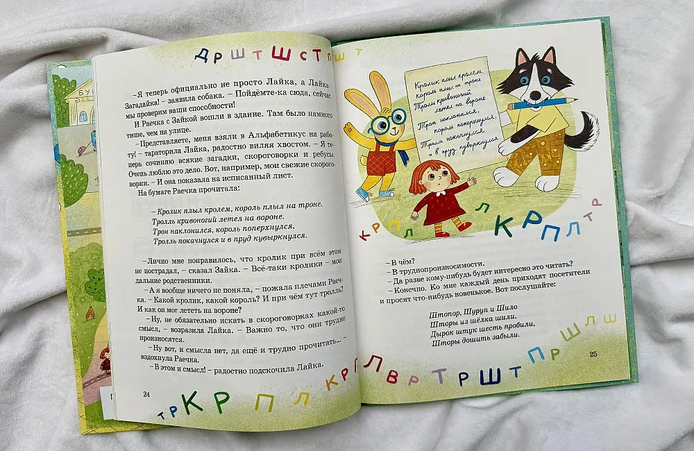 Главные герои, любознательная девочка Раечка и её волшебный друг Зайка-Читайка, оказываются в эпицентре праздника – Дня славянской письменности. Но торжество омрачено: в городе Альфабетикусе одна за другой начинают исчезать буквы! Юным сыщикам предстоит найти пропавших, а по пути разобраться с непроизносимыми согласными, звонкими и глухими звуками, составом слова и другими правилами русского языка.