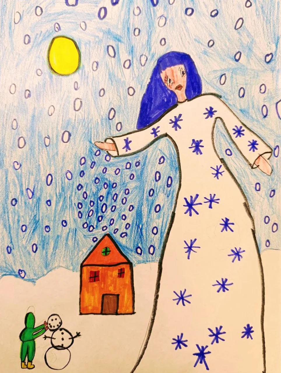 Вдруг в окно я увидела гигантскую синюю тётеньку, которая этот снег сыпала и сыпала из своих больших ладоней. Я очень испугалась, что тётенька засыпет весь мой дом и дедушка и бабушка потом меня и дом не найдут. Я позвонила дедушке и попросила пораньше прийти с работы. Бабушка на телефон не отвечала.