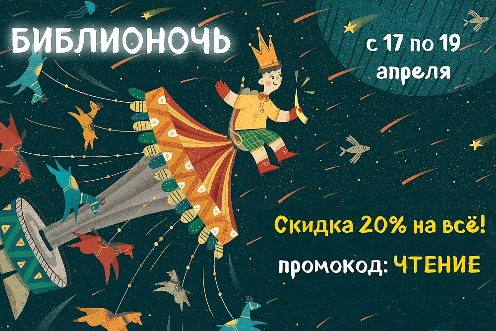Ежегодная всероссийская акция «Библионочь» в 2026 году пройдёт 18 апреля. Специально для этого дня библиотеки, книжные магазины, литературные музеи и культурные центры по всей стране подготовили праздничную программу: творческие мастер-классы, экскурсии, лекции, встречи с писателями и книжные ярмарки. По традиции мы также принимаем участие в акции и дарим дополнительную скидку 20% на все книги издательства по промокоду «ЧТЕНИЕ», которая будет действовать с 17 по 19 апреля.